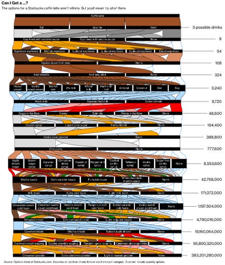 La chaîne de café Starbucks est un excellent exemple de cette explosion combinatoire. La combinaison de tous les suppléments proposés (chantilly, caramel, cannelle, etc.) permet de proposer une infinité de boissons différentes pour plaire à tous ses clients aux goûts parfois créatifs (cf. Le graphique proposé par Bloomberg). En revanche, la valeur de cette personnalisation entraîne une complexité qui représente un coût important pour les opérations dans la préparation.